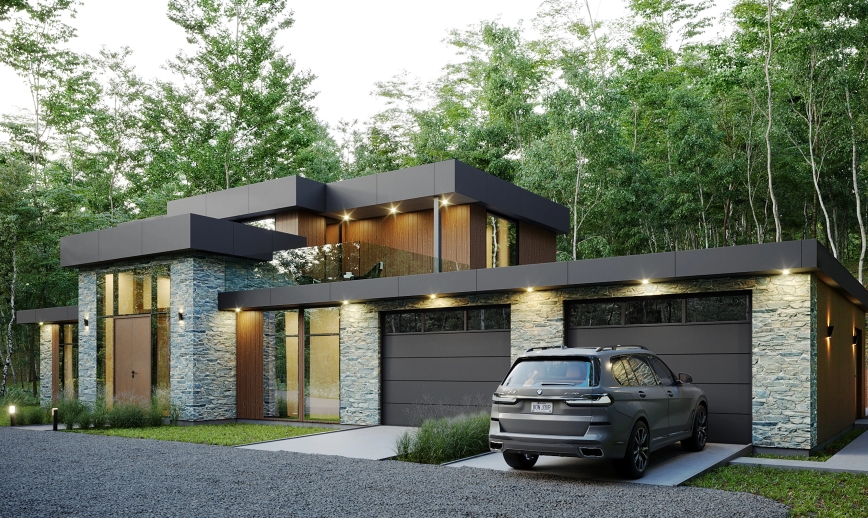 2 Car garage with 1 snowmobile independent entrance mud room and mechanical room in the garage